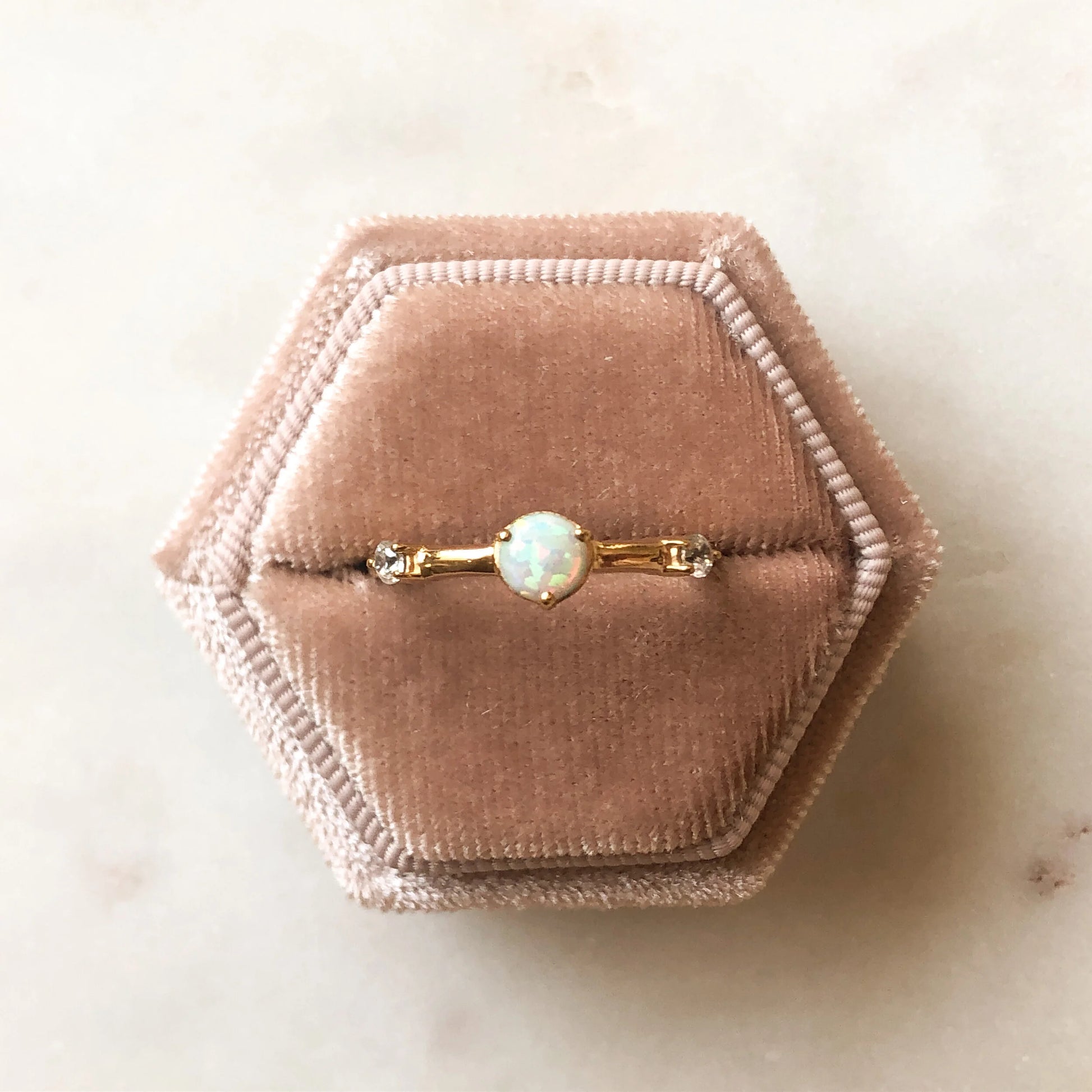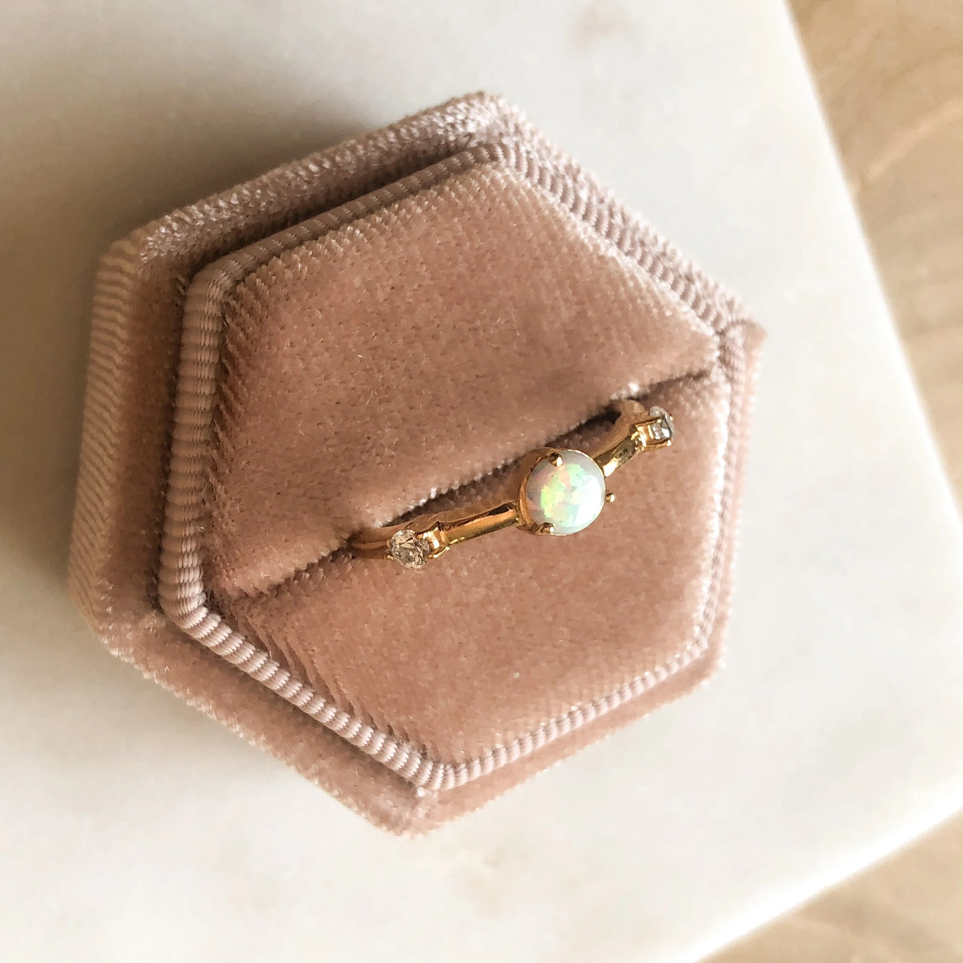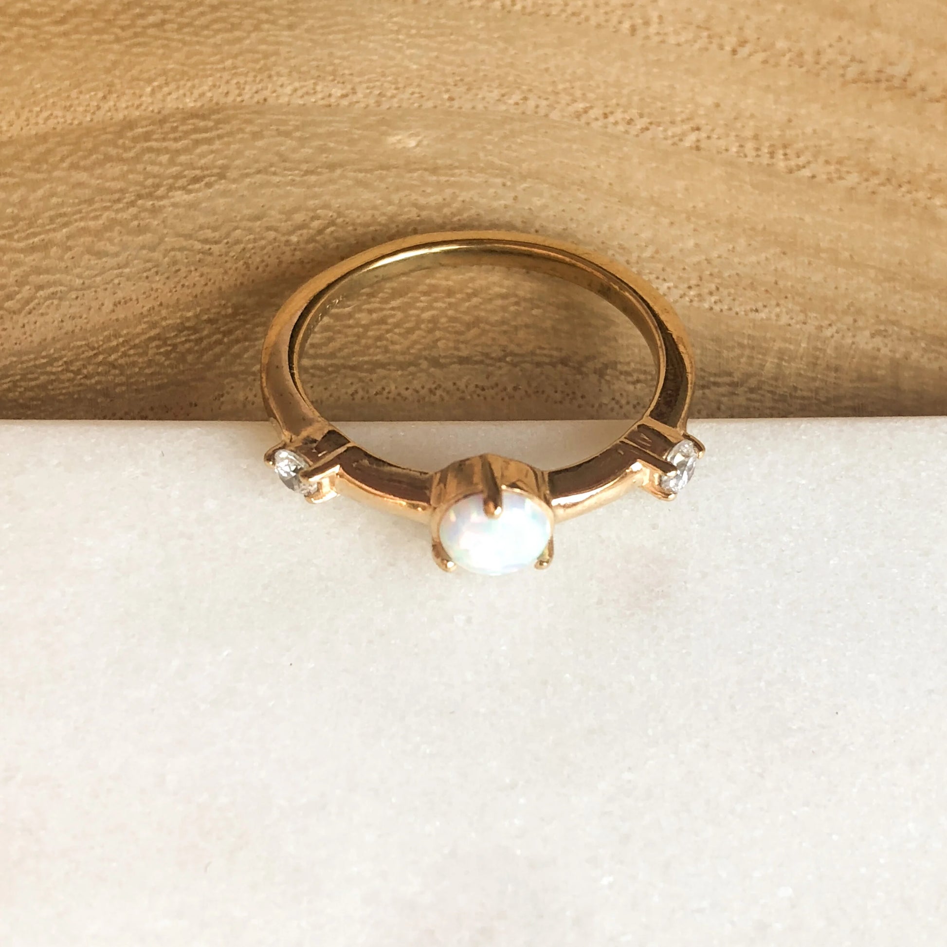 This one is a show stopper with stunning synthetic opal and CZ accents. Band is 14k gold plated sterling silver, 1.8mm thick.