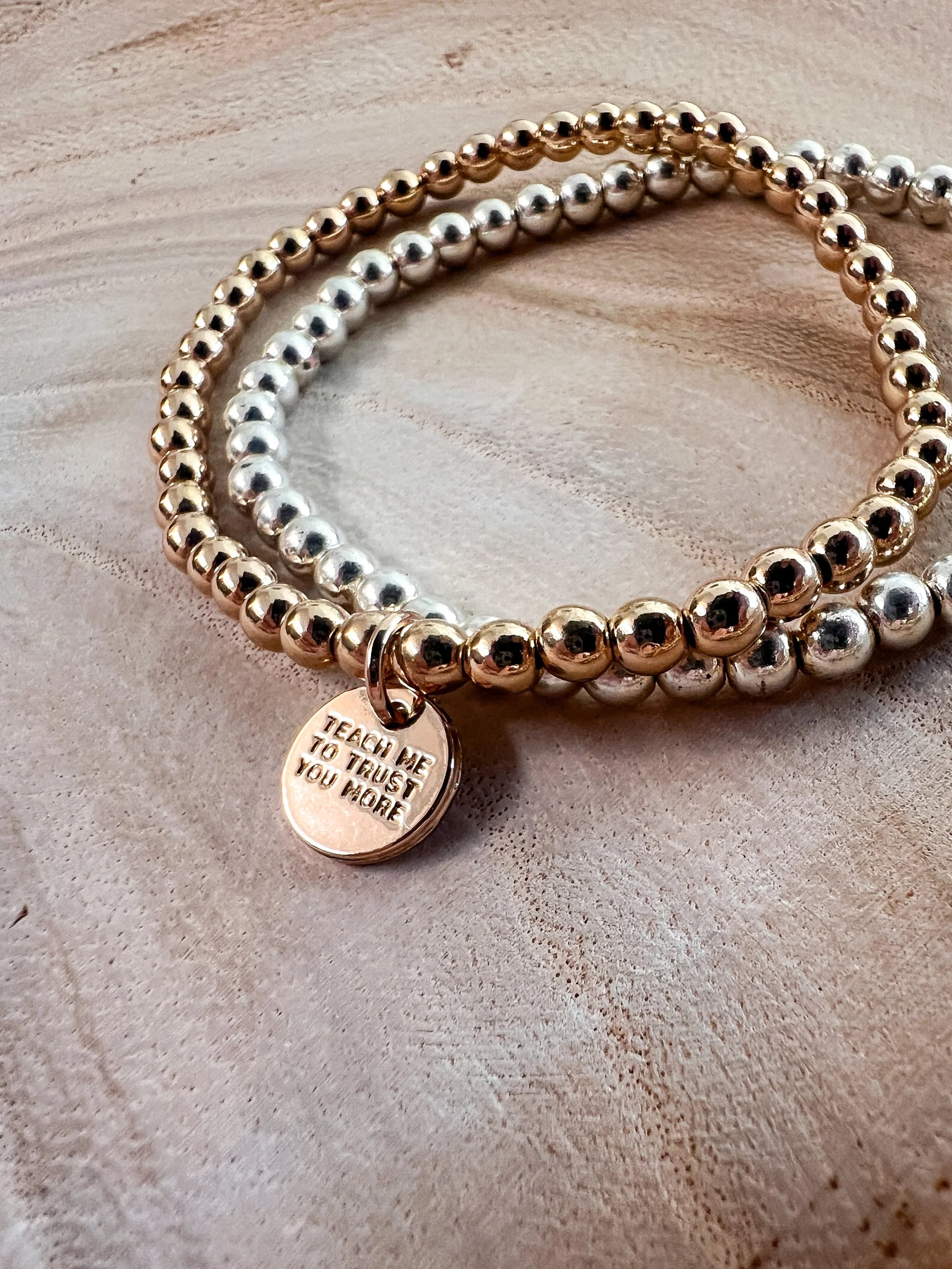 Our new stunning stretch beaded bracelet set features a gold plated stainless steel disc with words: Jesus I Trust in You, Help me to Trust You More.
