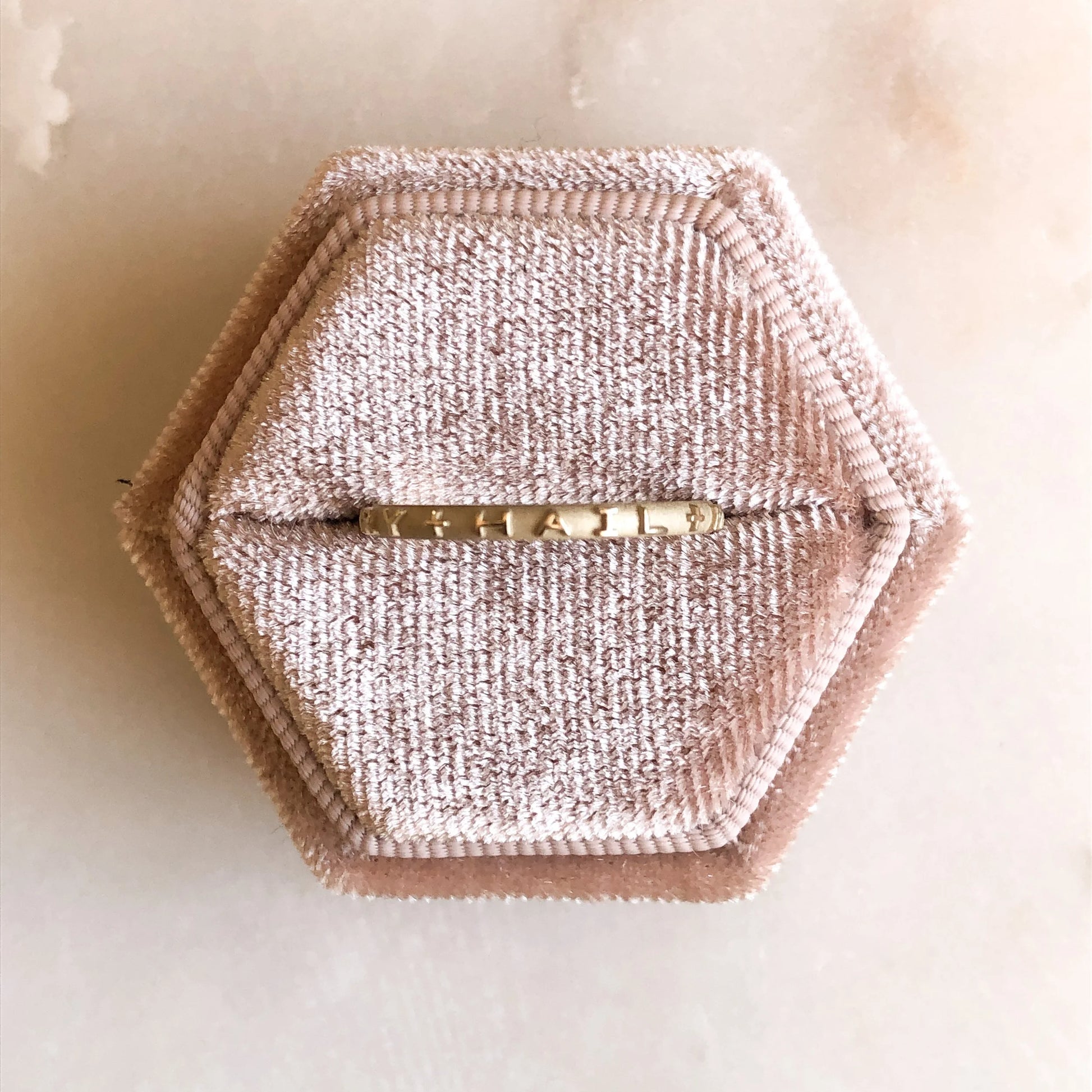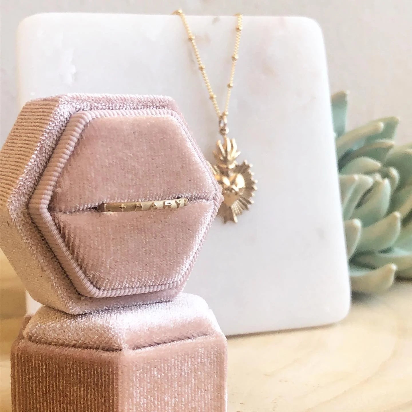 Hail Mary 10k solid gold ring featuring the words, "Hail Mary Full of Grace." Wear as a reminder of Our Mother's love. Ring come with complimentary dainty blush ring box.