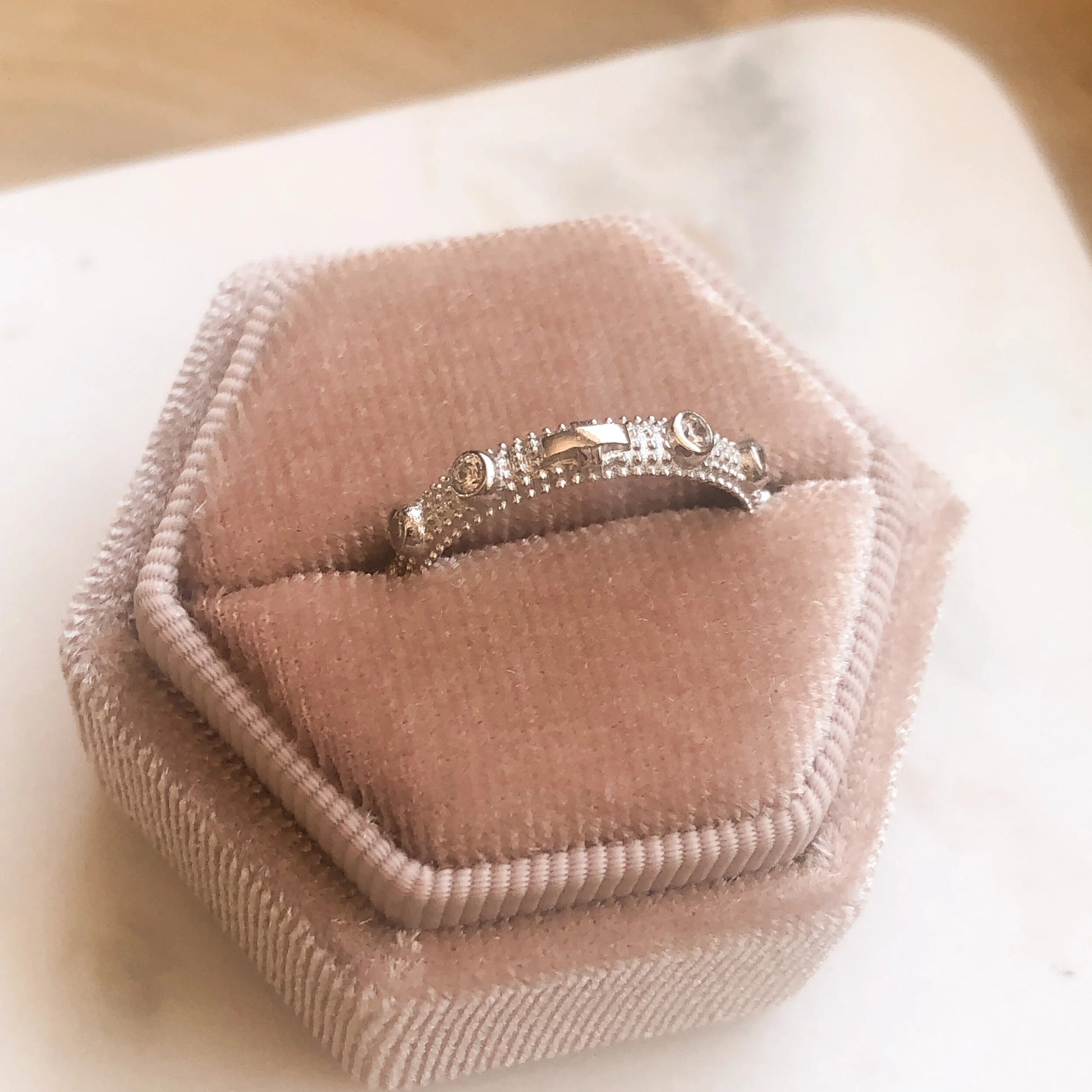 Heirloom sterling silver Rosary ring with Cross, textured band, and 10 cubic zirconia accents. Made in the USA and hand engraved by New England Silversmiths. Ring includes a deluxe sky blue velvet gift box.