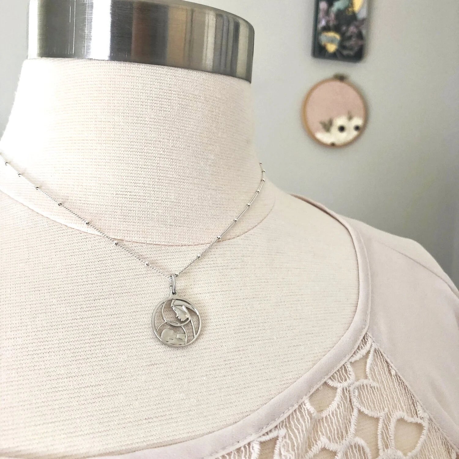 Open framed Madonna and Child pendant is suspended from an 18” silver, solid gold or gold-filled curb chain. This beautifully detailed open-work medal is approximately 3/4” in diameter.
