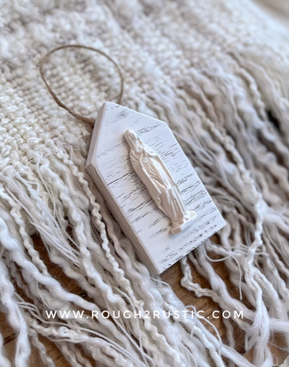 A beautiful pearly white or metallic gold mini Mary statue is mounted to a reclaimed wood backer in the shape of a shrine.