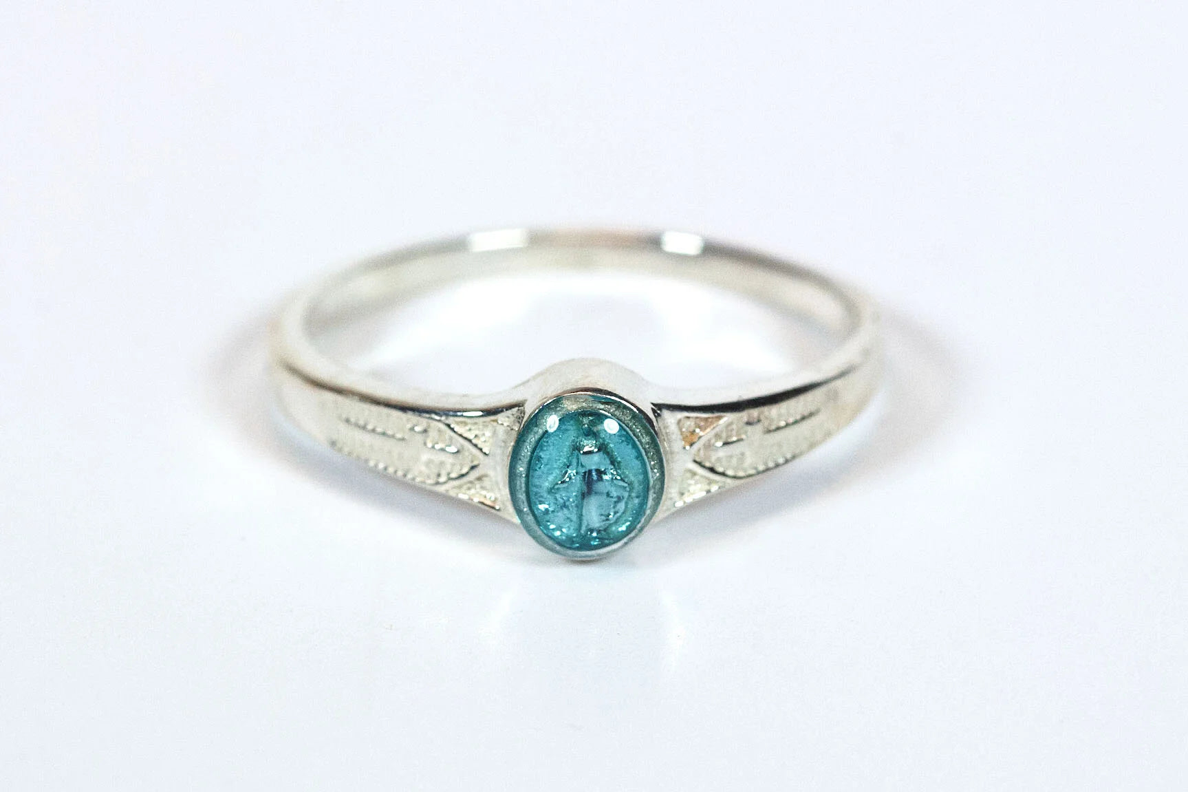 Sterling silver Miraculous ring with cross details on either side. The dainty Miraculous ring is available in sizes 3-9. Also available with pink or without epoxy accent.