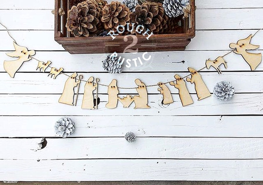 This heirloom quality 11-piece wooden garland is perfect for hanging on the mantle, across your windows, or even above a headboard. Each piece is sized so that it can be seen across the room (the Holy Family piece alone measures approximately 7.25 by 5 inches). It comes with a 7 foot long jute string for hanging.
