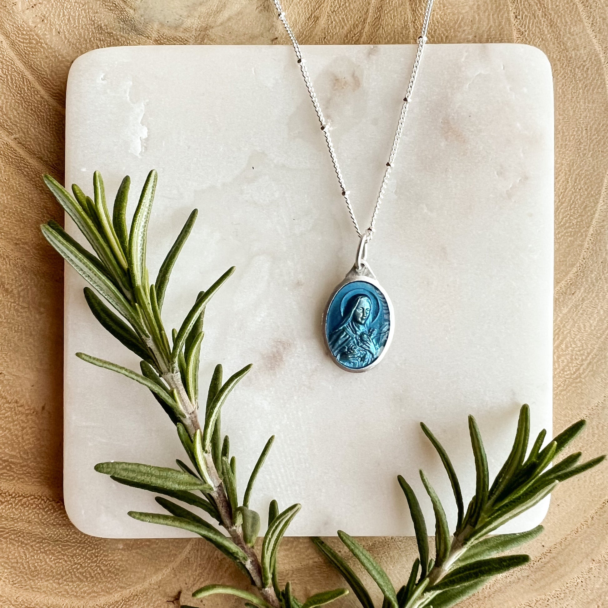 Sweet St. Therese of Lisiux pendant features beautiful blue accent cold enamel. Pendant is approximately 3/4" tall with cross on the back and "My God, I love You."
