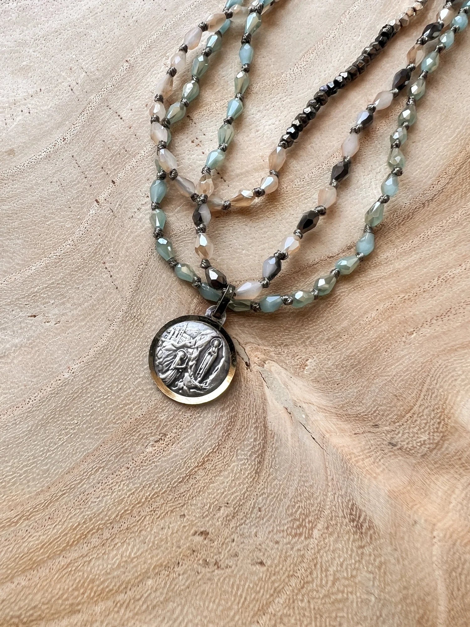 Round mixed-metal Our Lady of Lourdes medal is suspended from a 17”-18” beaded chain. Available with single or double strand.