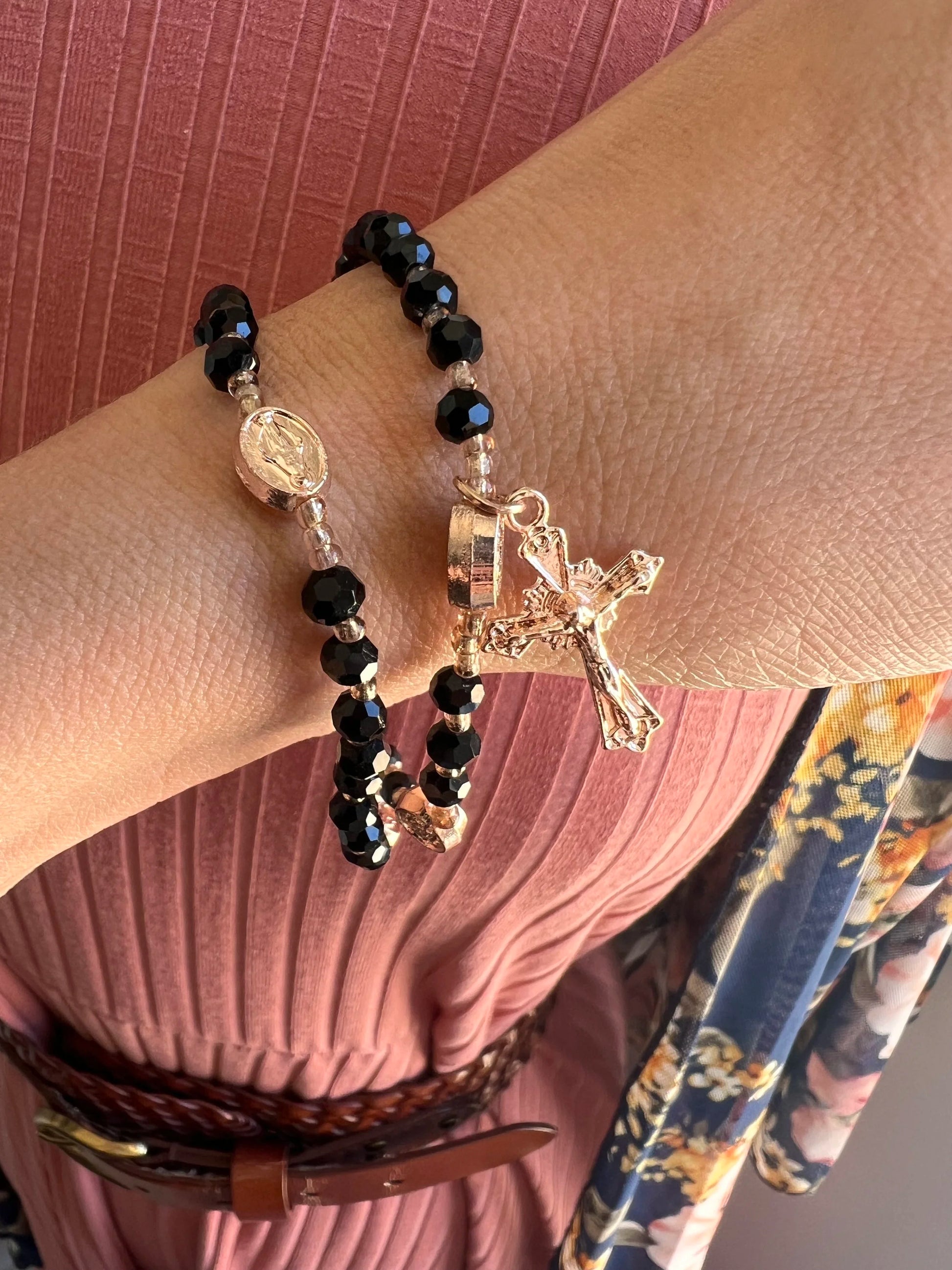 Our full Rosary is crafted with 4mm faceted black acrylic beads and accompanied by rose gold plated Crucifix and Miraculous Medals. Add a touch of grace to any outfit with this stylish and meaningful accessory.