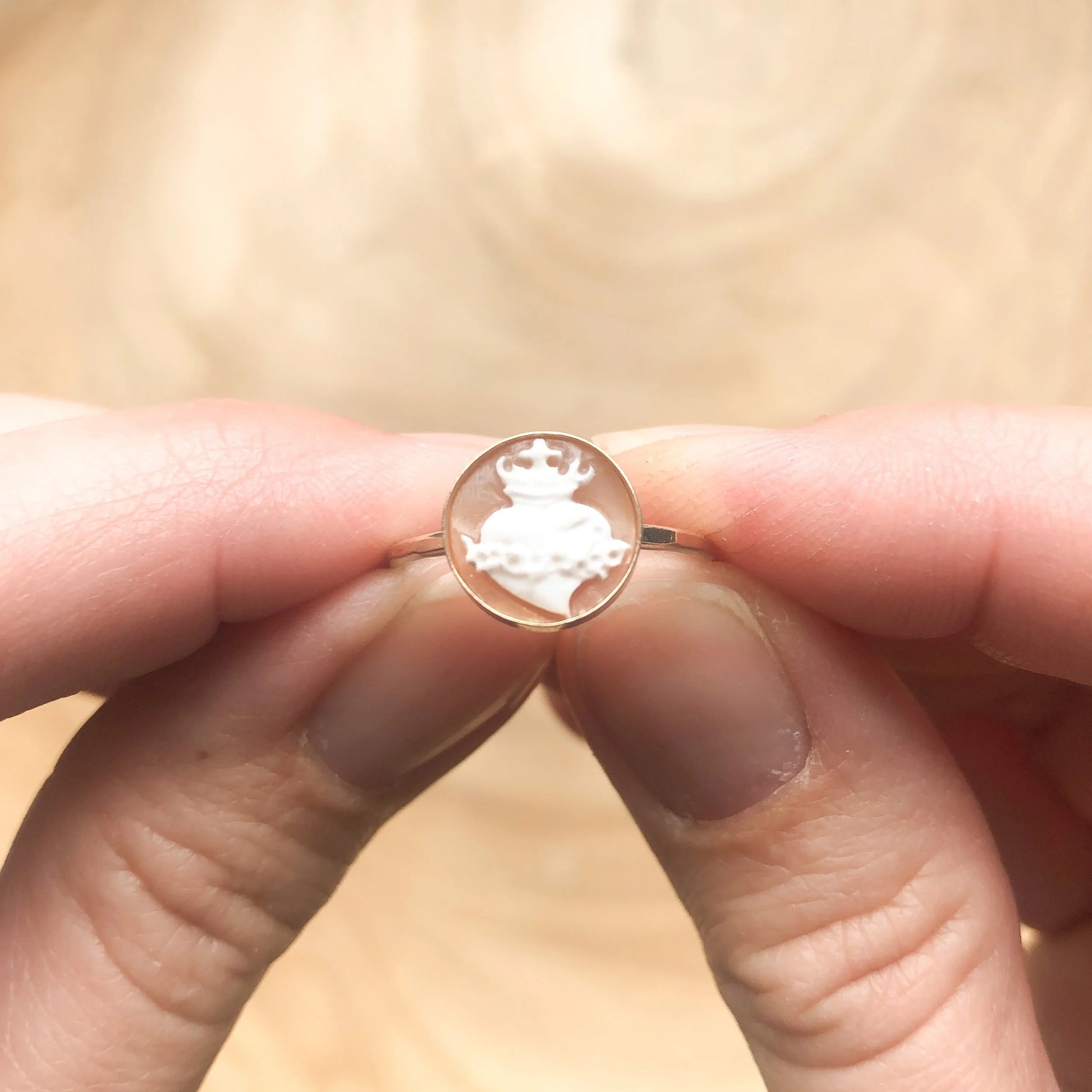 Inspired by vintage cameo rings, this exclusive Sacred Heart ring is handcarved in Italy from natural shell. The white is carefully etched away to reveal the fine detail of the Most Sacred Heart with a the pink background of the shell. The cameo is carefully secured within a 10mm, 14k gold-filled or sterling silver bezel ring made in the USA.
