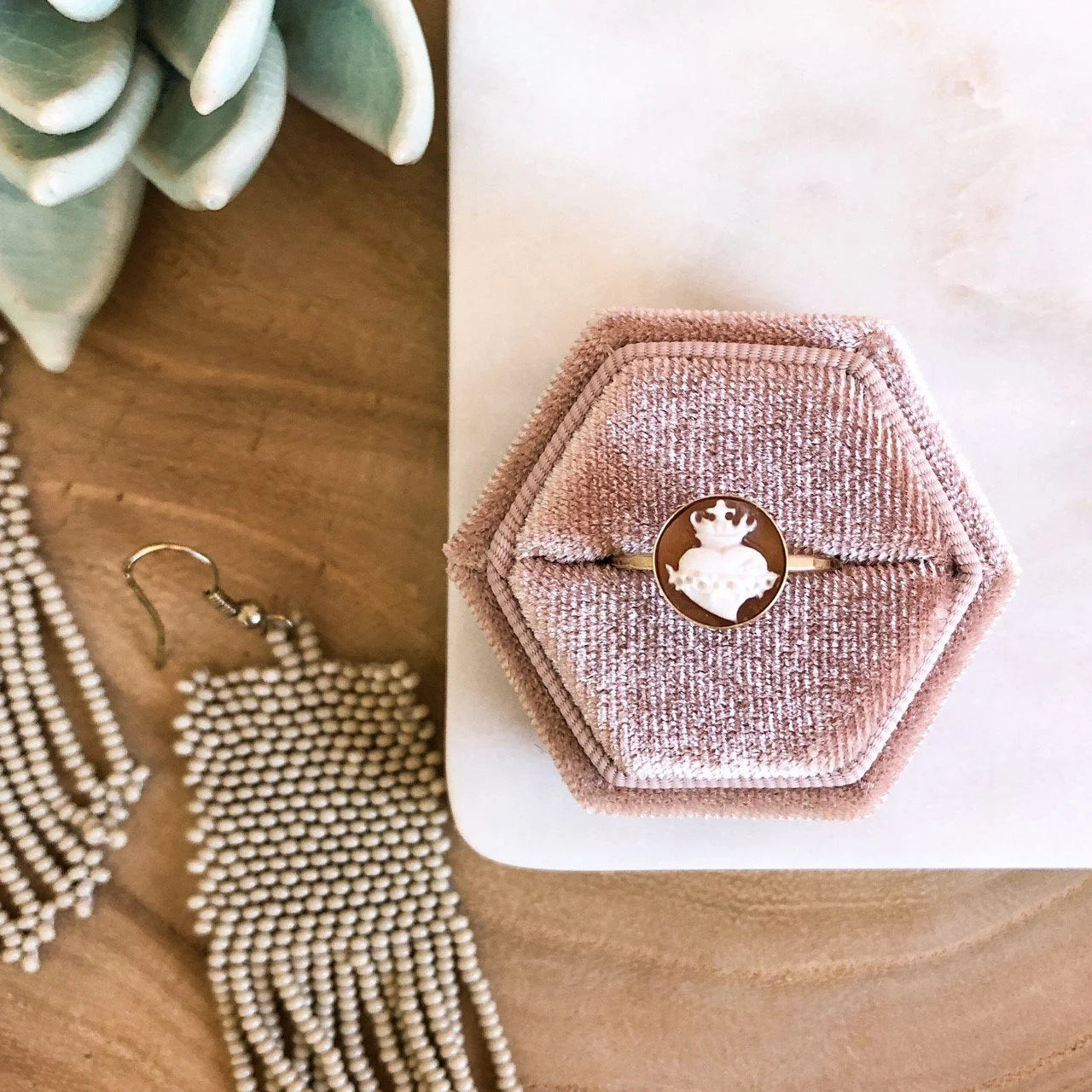 Our pale pink cameos are handcarved in Italy and set in bezel rings made in the USA.