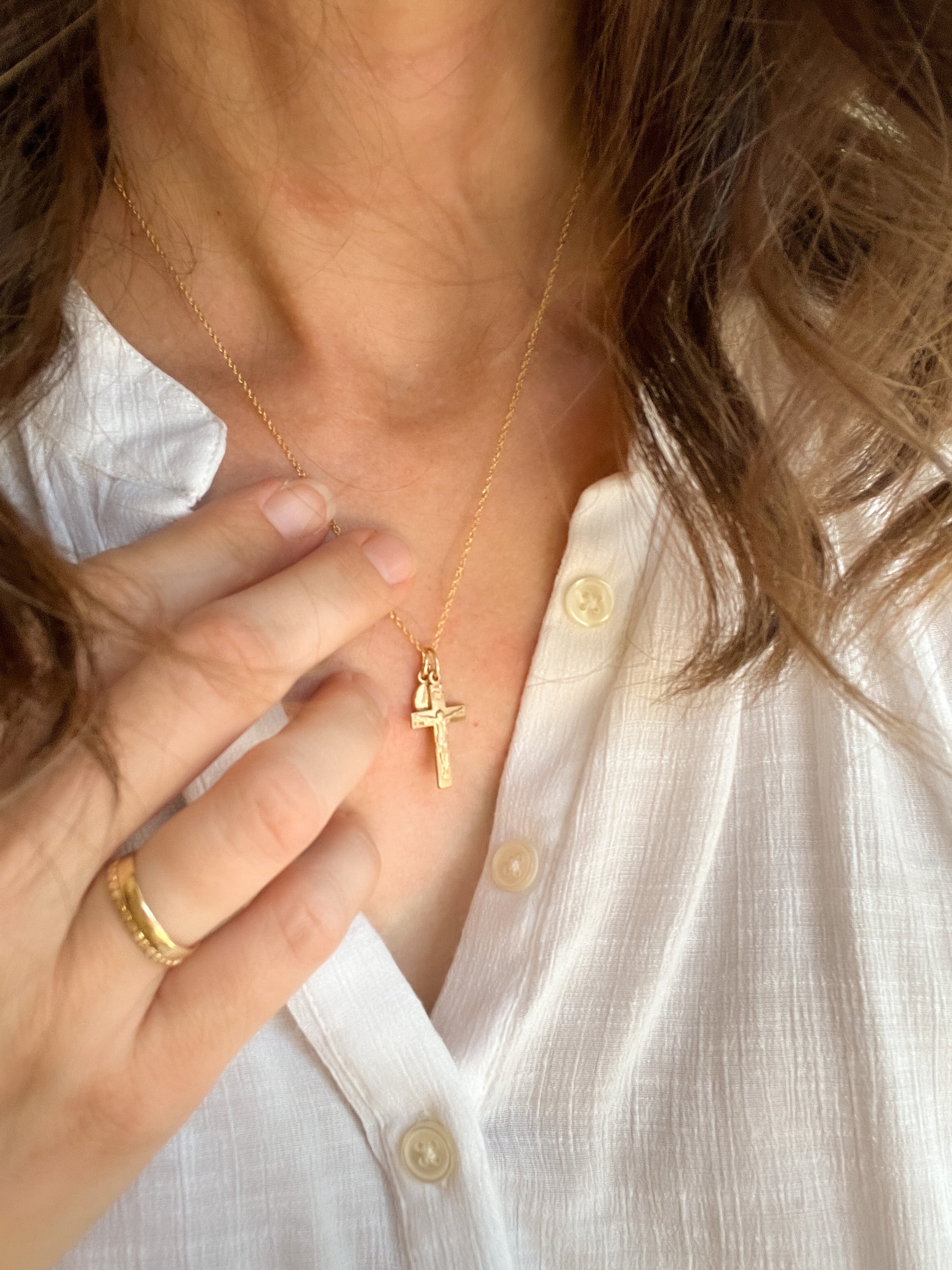 Crucifix is 7/8" tall, paired with a dainty 3/8" Miraculous Medal. Both medals are made in the USA and come with a lifetime guarantee.