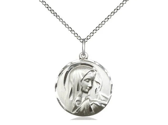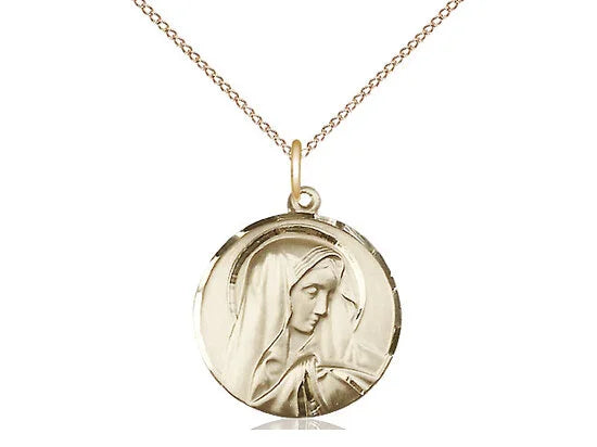 This stunning Marian medal is available in 14k gold-filled or sterling silver, suspended from an 18” curb chain. Pendant measures 3/4”x5/8” wide.