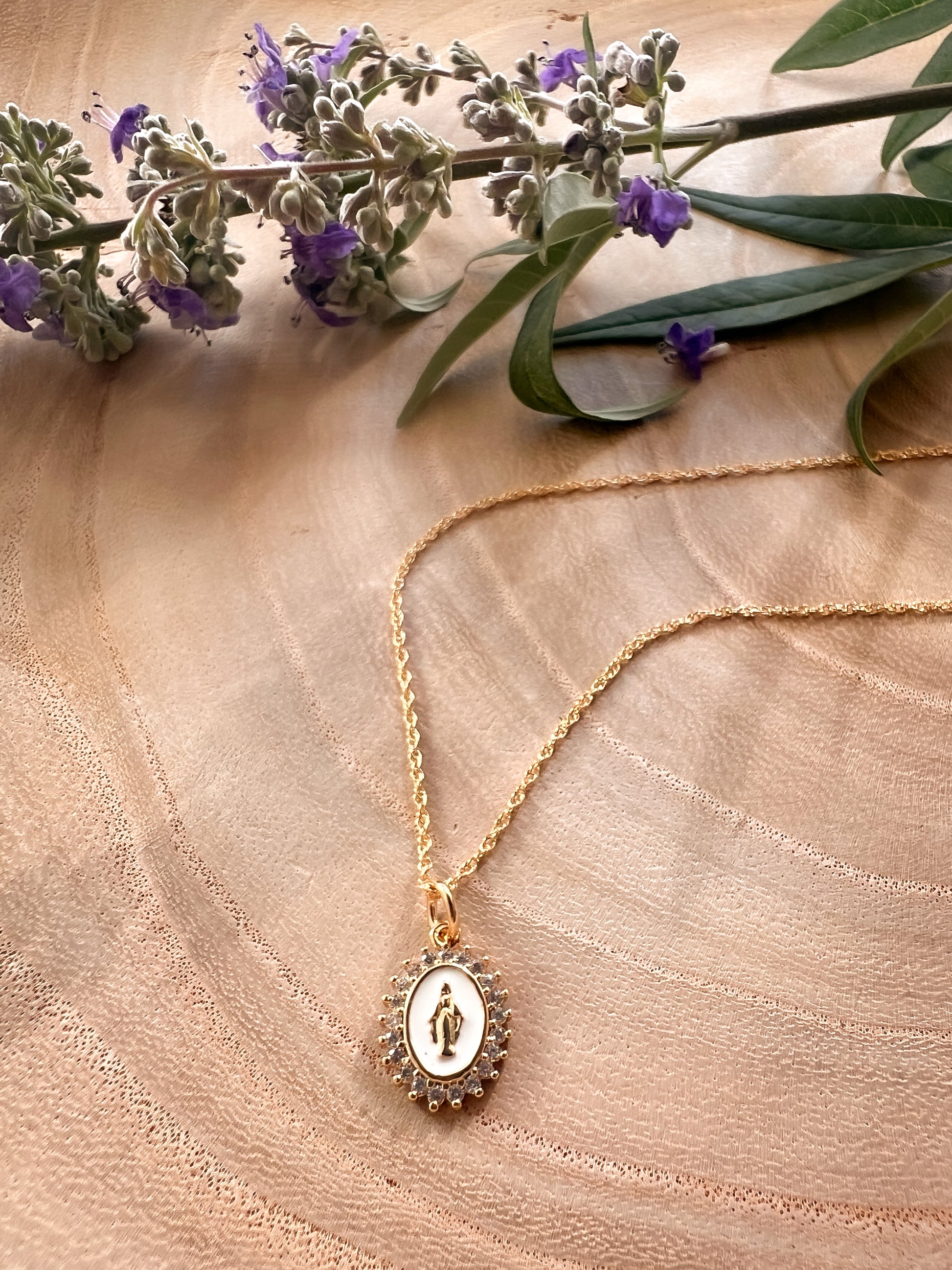 This dainty enameled medal beautifully features the revered image of the Immaculate Conception, accented by tiny cubic zirconia stones. The pendant, measuring 1/2" in height, is elegantly suspended from a sturdy, yet delicate, 16" gold-filled satellite chain.