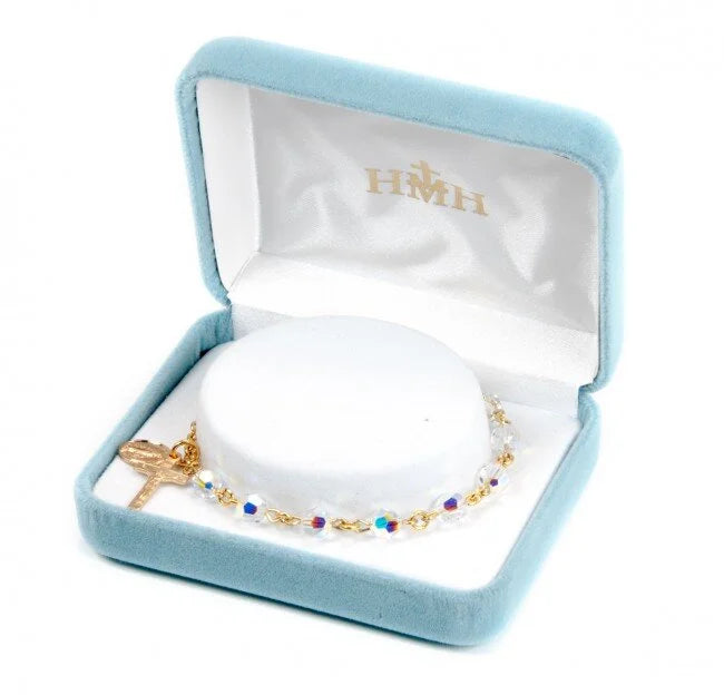 Stunning, aurora borealis round crystal beaded Rosary bracelet. Bracelet features Miraculous medal and Crucifix in gold over sterling silver with 6mm Swarovski crystal beads.